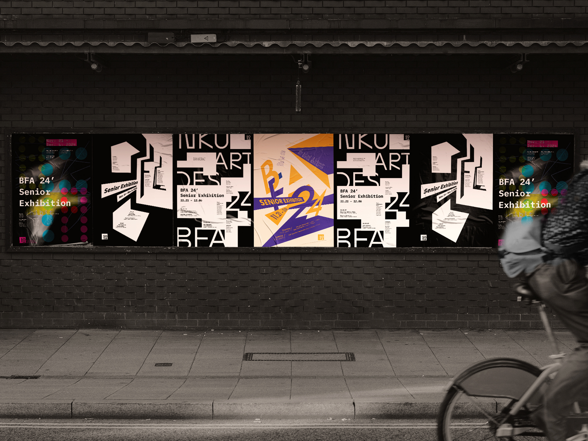 The design plays with abstract forms, varied layouts, and layered imagery to symbolize the many ways NKU students see and interpret the world through their art. Bold typography anchors the design while allowing space for diverse visual elements to coexist, creating a flexible system that balances individual expression with unified branding. Design explorations through 4 posters show the range of design directions and how the design can evolve with the main concept, authentically representing the diverse yet connected nature of the senior exhibition.