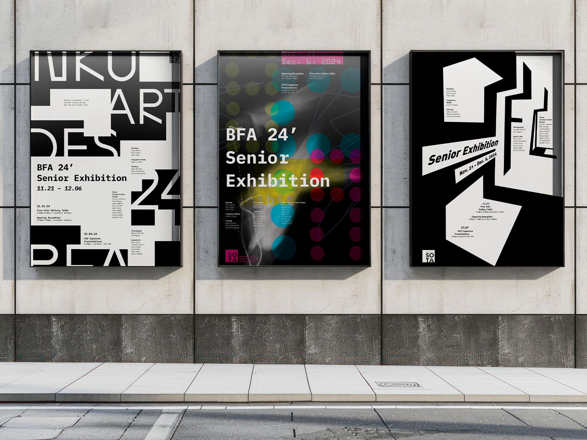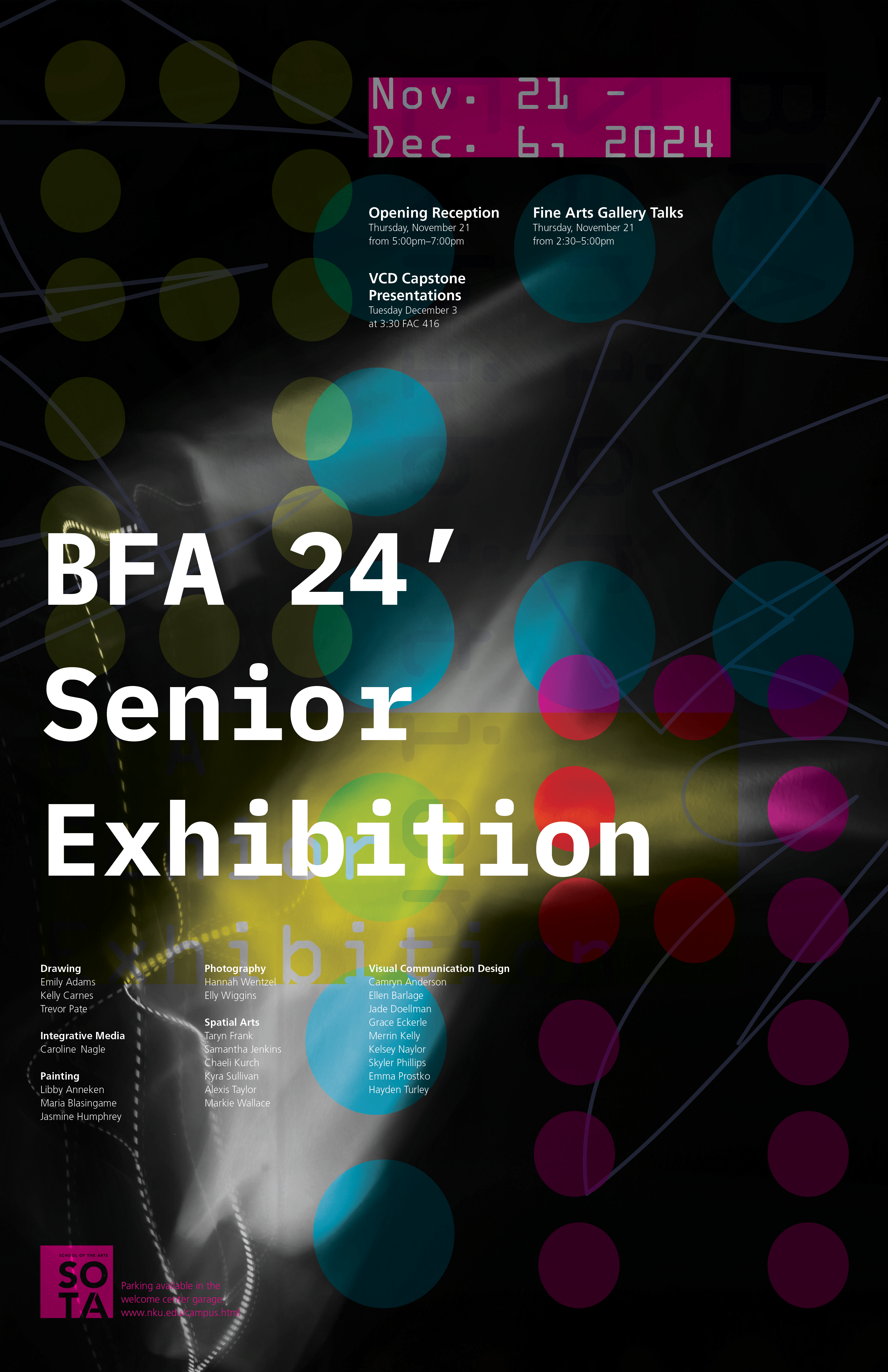 Create a poster for the Northern Kentucky University (NKU) BFA Senior Exhibition 2024, showcasing the senior shows of all the majors within the School of the Arts (SOTA) Art & Design department. The posters must capture the individuality of each discipline while uniting them under a common theme for the exhibition.
